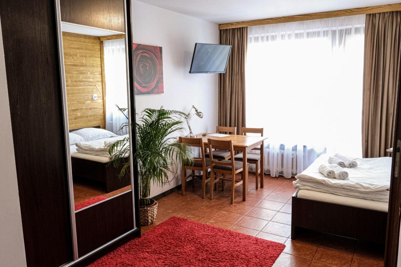 Pokój rodzinny z 2 sypialniami. Jest to apartament z 2 sypialniami, z których każda wyposażona jest w telewizor. Do dyspozycji Gości jest też łazienka z prysznicem oraz aneks kuchenny z lodówką. Apartament znajduje się na parterze. Rodzinny - 4 osobowy. Powierzchnia pokoju ok.: 36 mkw. ;